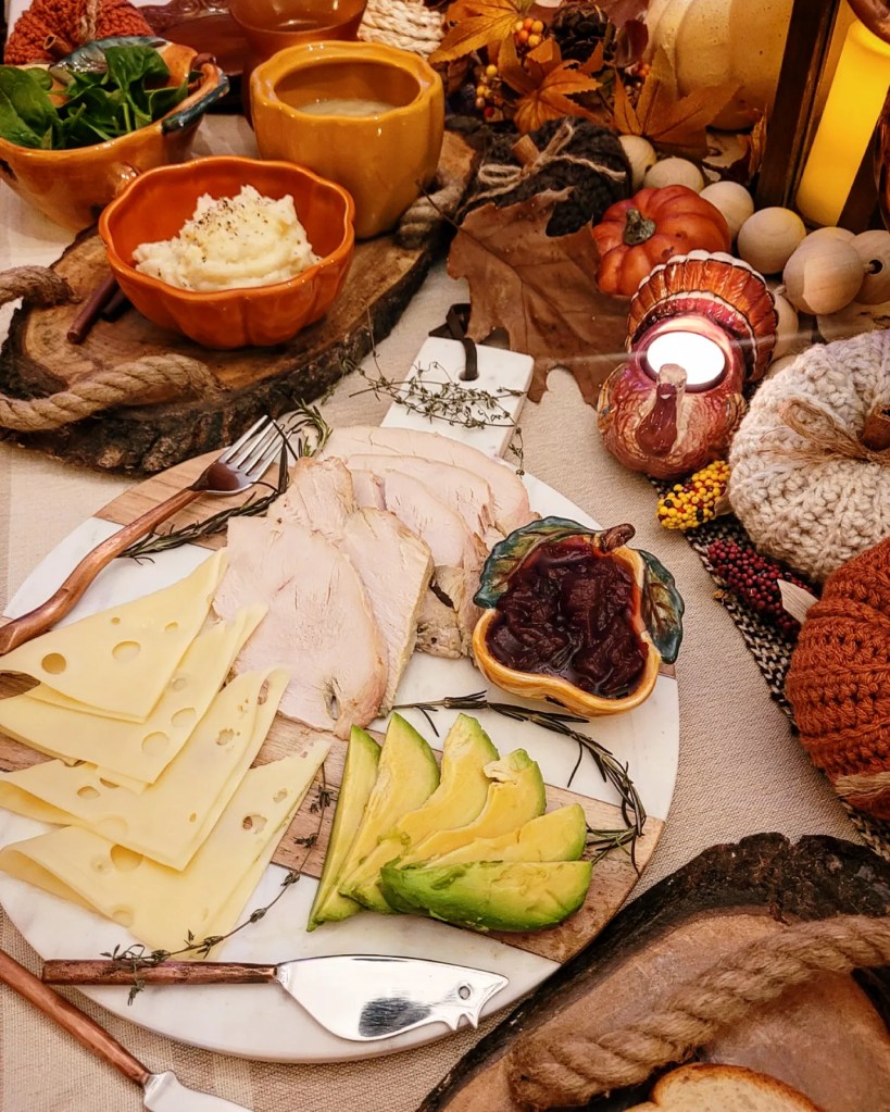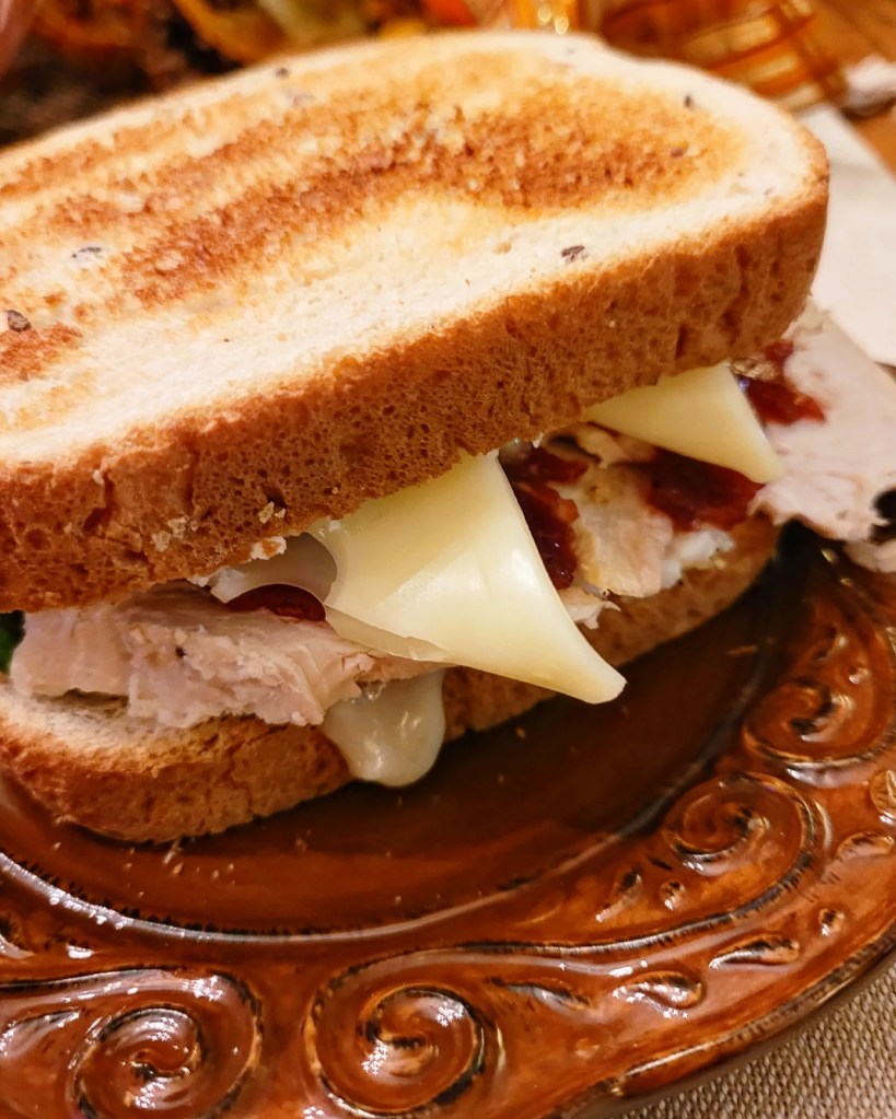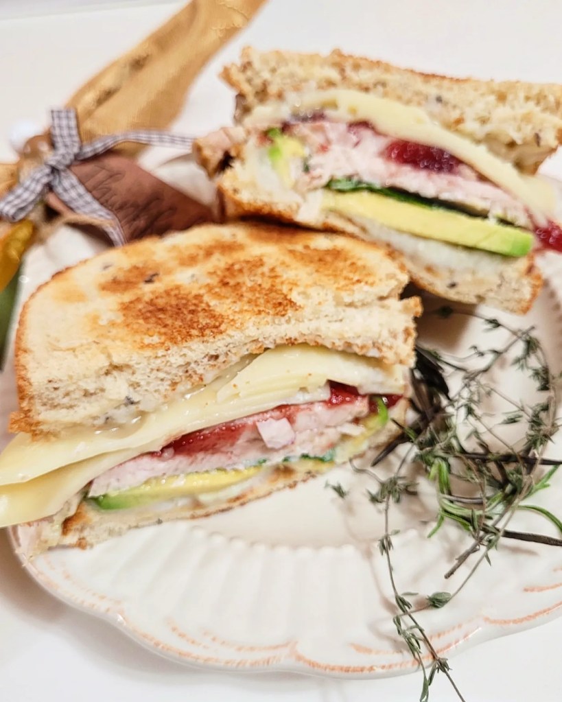 Warm up turkey, gravy, and mashed potatoes in the microwave (in separate bowls). Toast your bread. Spread a layer of mashed potatoes on each bread slice and then a layer of gravy on top of that. On the bottom slice put a layer of avocado slices. Lay your spinach or greens on top of the avocado, then add the turkey. Now spread a good layer of cranberry sauce over the turkey (in my opinion the cranberry sauce is the key ingredient of this sandwich…just makes the flavor pop!). Grind your preferred amount of pepper onto the sandwich. Add a layer of the sliced cheese. Place the other slice of bread on top, mashed potato side down and give it a little press! Firmly hold the sandwich down on the plate and cut in half. And there it is!!! Yum!!